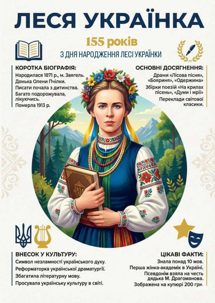 25 лютого виповнюється 155 років від дня народження Лесі Українки – видатної поетеси, драматургині, перекладачки, публіцистки, однієї з найяскравіших постатей української та європейської культури кінця ХІХ – початку ХХ століття. Дивитись: Культурна героїня 21 століття , Поетка зламу століть (Леся Українка) 25.02.2026 |