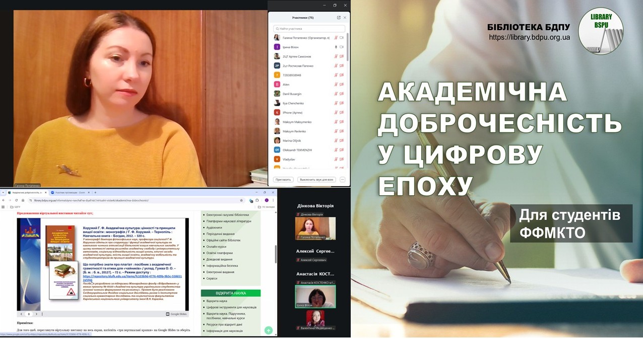 Ця політика була представлена під час інформаційного заходу у віртуальних стінах бібліотеки БДПУ для Факультету фізико-математичної, комп’ютерної та технологічної освіти (ФФМКТО). Участь взяли 77 осіб — викладачі та студенти — які мали змогу дізнатися про ключові аспекти академічної етики в епоху ШІ.