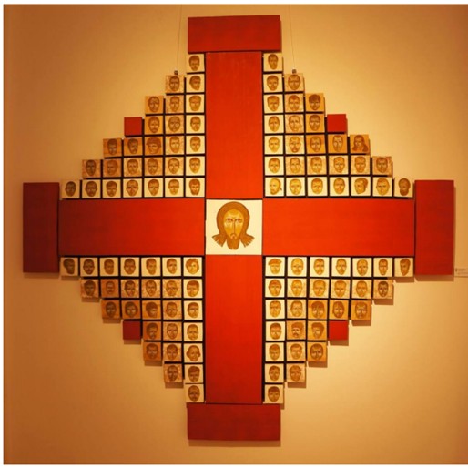 Богдан Новицький «Небесна сотня». Це твір у формі рівностороннього хреста, навколо якого в окремих квадратах портретовані 108 героїв, що загинули на Майдані.