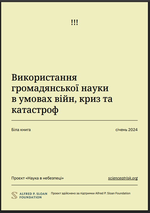 Використання громадянської науки в умовах війн, криз та катастроф / Олена Козак, Ілона Свєженцева, Олексій Болдирєв, Катерина Шаванова. – 2024. – 36 с. – (Проєкт «Наука в небезпеці»).