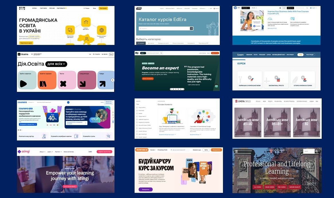 atingi (https://www.atingi.org/learn/courses) – цифрова освітня платформа, створена за підтримки Федерального міністерства економічного співробітництва та розвитку Німеччини (BMZ). Пропонує курси з цифрових навичок, підприємництва, охорони здоров’я, туризму, сталого розвитку тощо. Орієнтована на країни, що розвиваються.